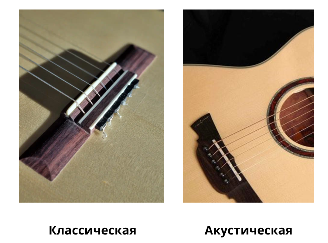 Для классической гитары используются только нейлоновые струны, мягкие и комфортные, но звучащие менее ярко. Акустическая гитара оснащена металлическими струнами, что даёт мощный, яркий звук, но они жестче для пальцев.