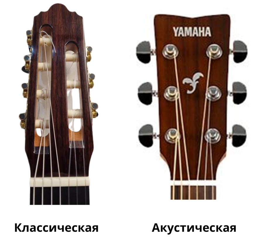 Классическая гитара имеет открытые колковые механизмы, врезанные в головку грифа. Акустическая гитара может иметь как открытые, так и закрытые колковые механизмы, но чаще оснащена цельной головкой грифа с закрытой колковой механикой.